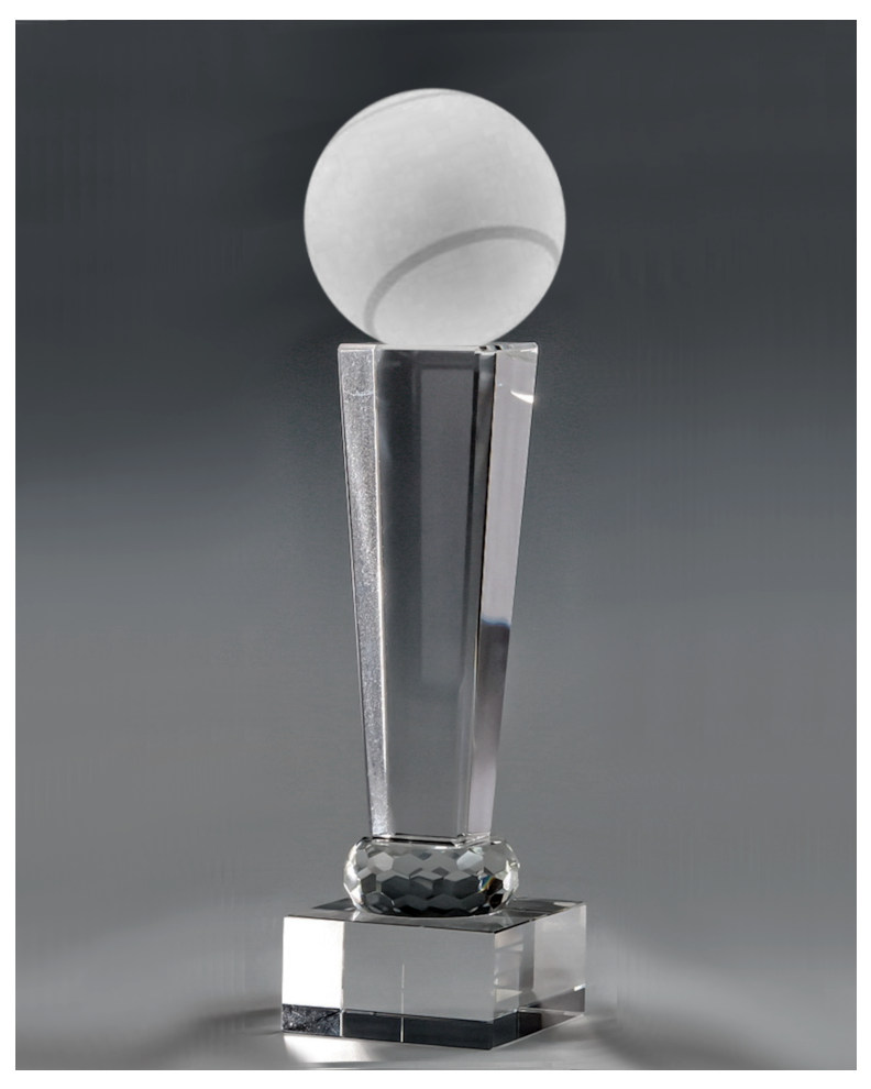 Ein Glasaward mit einem Glastennisball und Glassockel, welcher mit einem Sockelschild versehen werden kann. Schlicht und doch elegant. Der Glaspokal kann mit einem Sockelschild individualisiert werden.
